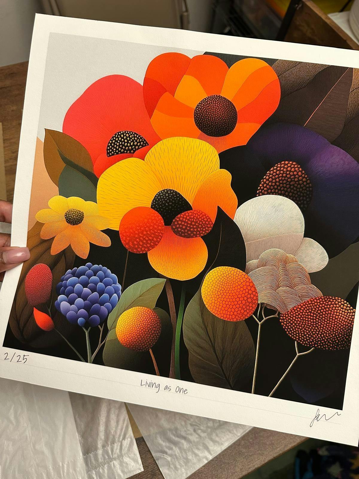 The Story "Living as One" invites us to witness nature's masterclass in diversity. Like flowers in a wild meadow, each bloom asserts its unique identity while contributing to a greater harmony. This vibrant composition challenges us to recognise beauty in our differences, suggesting that humanity, like these radiant blooms, achieves its fullest expression through celebration of our distinct colours, patterns, and forms.
